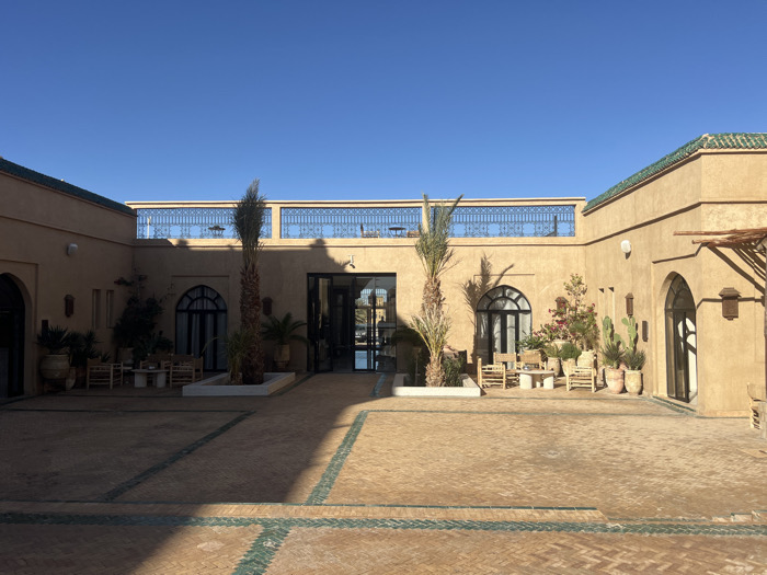 An unoccupied, rectangular open-air courtyard of a building in Rissani, Morocco, is presented under a clear blue sky