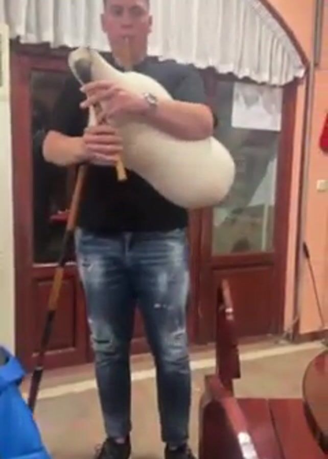 A man in jeans and a black t-shirt is playing a bagpipe indoors. He is standing in front of a set of double doors with a window, while a person in a blue jacket sits at a wooden table. The camera pans to show a stone fireplace with a fire burning in it. The table is covered with a red and white patterned tablecloth. Decorative items are on the mantel above the fireplace.