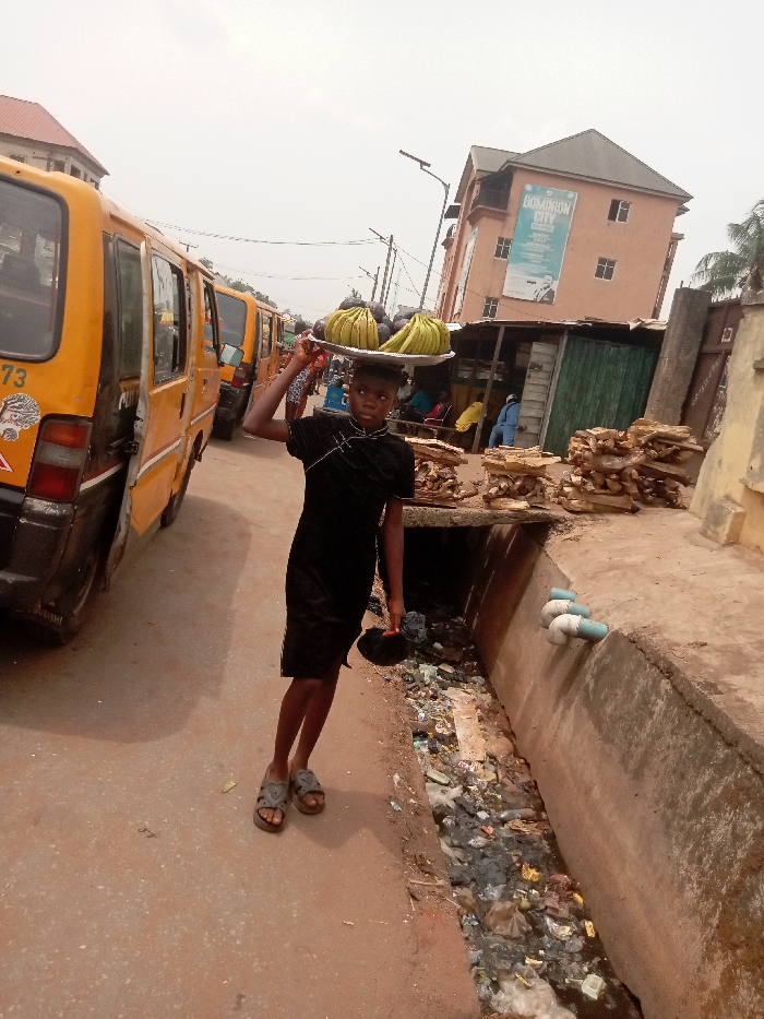 A young individual, appearing female and dressed in a dark short-sleeved dress with light trim, walks forward on a reddish-brown paved road in Umudioka, Nigeria. They are wearing grey sandals and balance a round, silver-colored metal tray on their head, laden with multiple green and yellow plantains or bananas. In their left hand, they hold a dark, ambiguous object. To their immediate left, a line of several yellow passenger vans, consistent with commercial buses, are parked or slowly moving. The nearest van displays a partially visible number "73" on its rear and an indistinguishable graphic. To the individual's right, a concrete drainage ditch runs parallel to the road, filled with dark liquid, plastic waste, and general refuse. Two light blue PVC pipe elbows protrude from the ditch's wall. Beyond the ditch, stacks of cut firewood are neatly arranged on the ground, indicating a vending area. Further back, improvised market stalls with corrugated metal roofing and walls are visible, with several people faintly discernible within or near them. In the background, a multi-story, light brown building with numerous windows dominates the right side. A large banner or billboard affixed to its side displays "DOMINION CITY" and a male figure. The sky is overcast or hazy, providing diffused light.