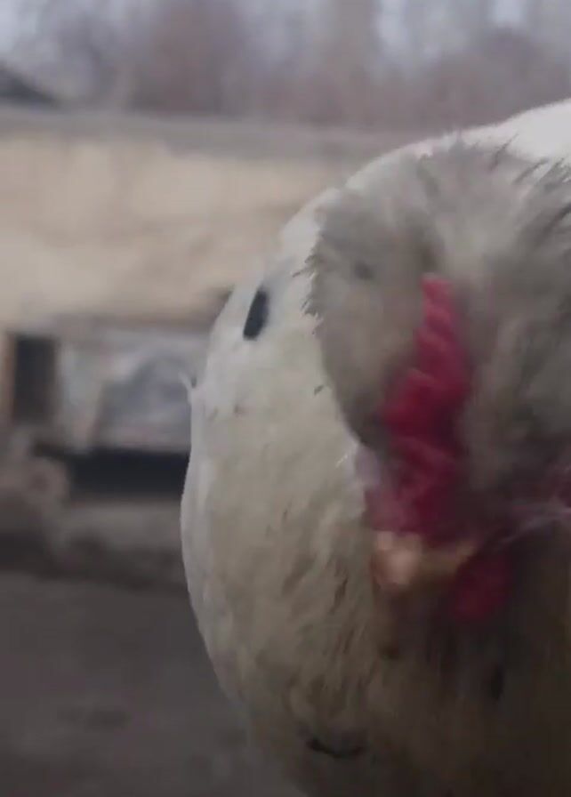 close-up of a white chicken with black spots looking directly at the camera. The chicken has a red wattle and comb. The background is blurry, showing a fence and some bare trees. The chicken blinks its eyes.