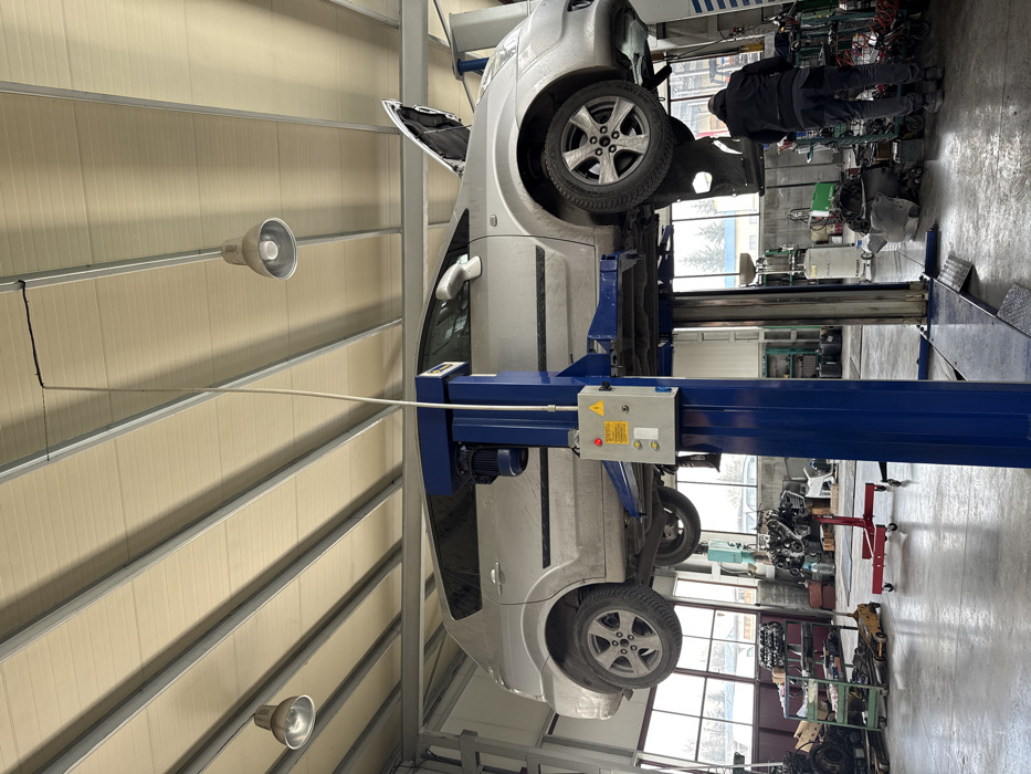 The scene is an interior view of an automotive repair shop located in the city of Trud, Bulgaria. A silver-colored five-door hatchback or small SUV, heavily soiled with dirt on its exterior, is elevated on a blue two-post hydraulic vehicle lift. The vehicle's hood is open, and a black plastic wheel well liner is detached and hangs partially from the front right side. The vehicle is positioned centrally, supported by the lift arms. In the lower right portion of the image, a male individual is visible from the back, wearing a dark jacket and dark pants, standing and facing away from the viewer. He appears to be examining or working on components located on the floor beneath the lifted vehicle's front section. The workshop features a concrete floor and a high ceiling constructed with light-colored ribbed panels supported by metal beams. Two grey industrial pendant lamps hang from the ceiling, providing illumination. A white electrical conduit or hose extends vertically from the ceiling near the lift. To the left of the main lift, various auto parts, including engine components, are arranged on multi-tiered shelves and a red engine stand. A yellow floor jack is also present. To the right and rear of the lifted vehicle, additional tools, parts, and containers are visible on the floor and on shelving units. A white cylindrical object, possibly a fluid collection tank or air tank, is in the mid-ground. Large windows along the back wall provide natural light and offer a glimpse of an exterior landscape with bare trees and a cloudy sky.