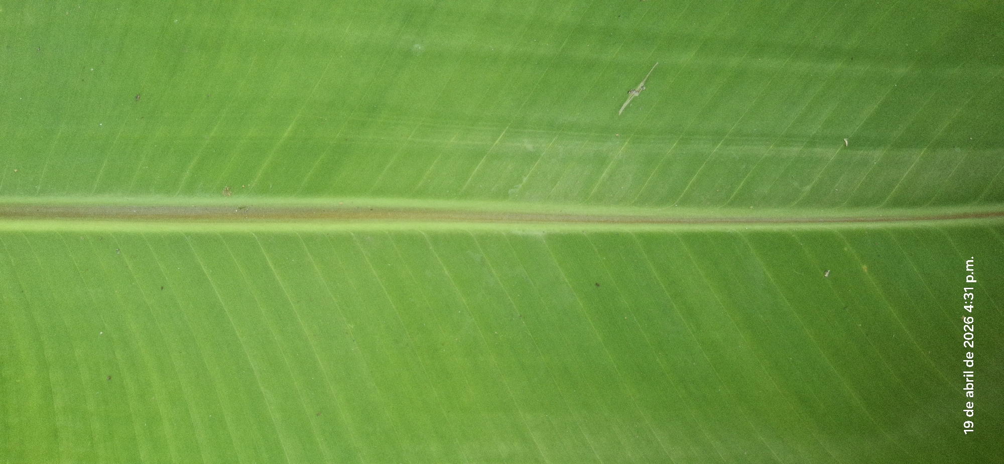close-up view of a green banana leaf. The leaf's central vein runs horizontally across the middle of the frame, exhibiting a reddish-brown hue. Parallel veins are visible on both sides of the central vein, creating a textured pattern. A few small debris or imperfections are scattered on the leaf's surface. At the bottom right corner, text is visible, reading "19 de abril de 2026 4:31 p.m." The specific location in Vallecito, Venezuela, cannot be determined from the image. The scene depicts a still, natural environment with no people or actions visible. The primary subject is the banana leaf.