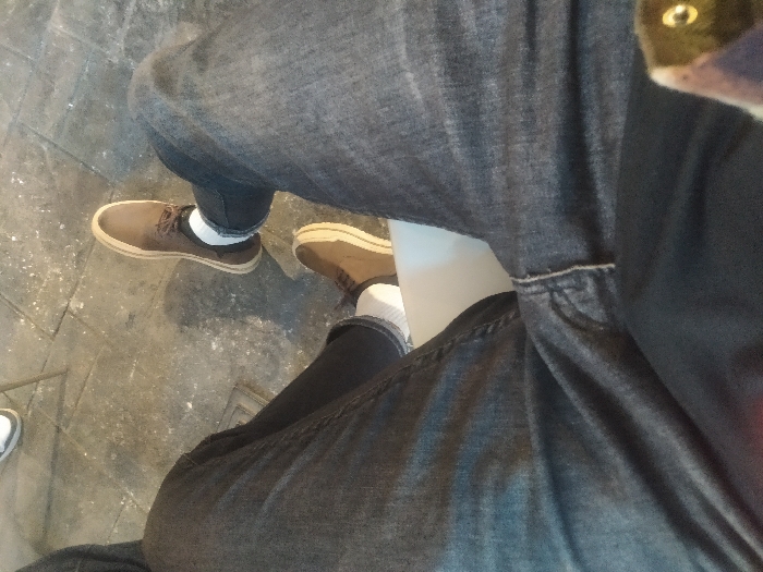 The image presents a first-person, downward-facing perspective centered on the legs and feet of multiple individuals on a textured paved surface. The photographer's legs, clad in dark blue denim jeans, are visible from the upper thighs downwards, indicating a seated position. A blurred white object, possibly a seat or table, is situated between the photographer's legs. In the lower right foreground, a partial dark fabric object featuring a single brass eyelet is discernible. To the right of the photographer's legs, the lower legs and feet of at least one other individual are present. This person is wearing dark brown lace-up shoes with light beige soles and white socks that are visible above the shoe line. Their trousers appear dark, with cuffs rolled or cropped. A small portion of a white shoe is visible in the upper left background, suggesting another presence or object. The ground is a light grey, textured pavement, consistent with concrete or stone, showing scattered lighter particles or dust. Shadows are cast on the surface, indicating illumination from an overhead source. No specific visual identifiers within the image itself indicate the precise location within the city of Meknes, Morocco.