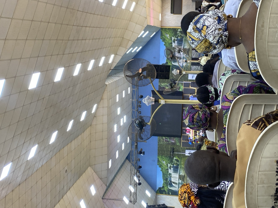 This image depicts an indoor gathering in a large hall located in Narayi, Nigeria