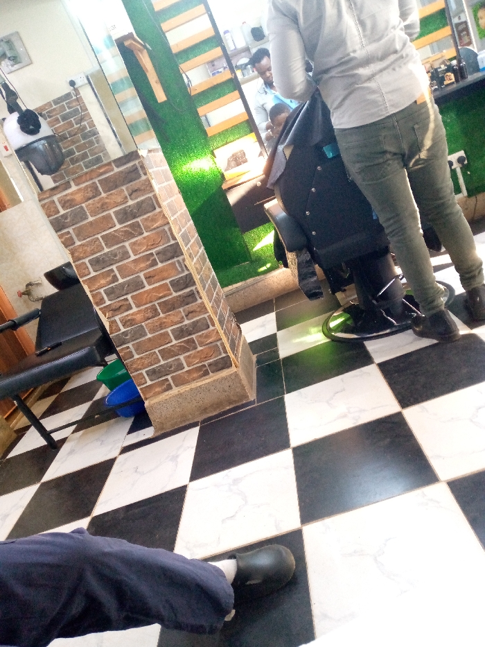 A barber cuts a customer's hair in a shop with a black and white checkered floor. The barber stands on a foot rest of the black barber chair. A decorative brick column stands near a row of seats. A green wall with wooden accents decorates the shop. A blue and green bucket is located under the seats. Another person's leg and foot is in the foreground.