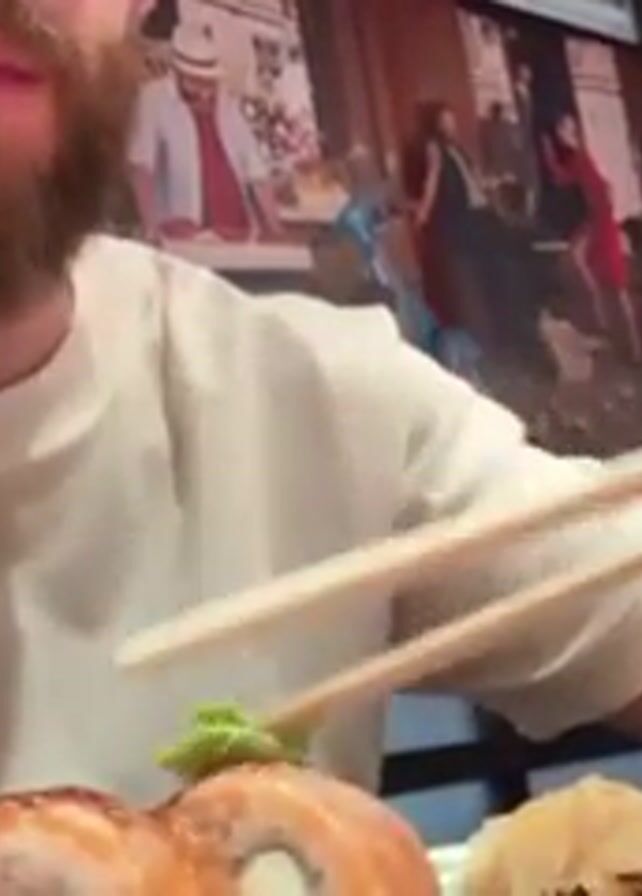 - "A man with a beard and a white t-shirt is using chopsticks to pick up a piece of sushi" by FM-ARrGE2, licensed under CC BY 4.0
