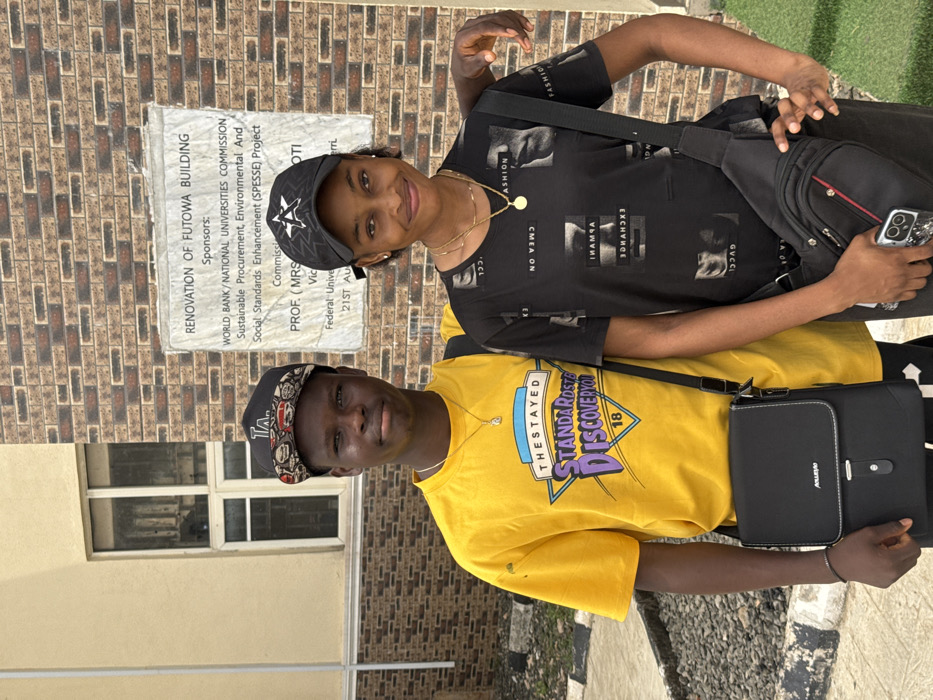 Two individuals, a young male and a young female, are positioned outdoors in front of a brick building. The location is the Federal University of Technology, Owerri (FUTO) campus in Ihiagwa, Nigeria. This is confirmed by a white plaque on the wall stating "RENOVATION OF FUTOWA BUILDING," sponsored by "WORLD BANK / NATIONAL UNIVERSITIES COMMISSION" and the "SPESSE Project," commissioned on "21ST AUG" by "PROF. (MRS) [...]OTI" from the "Federal Unive[rsity]." The male subject, positioned on the left, has a dark complexion. He wears a black flat-brimmed cap, a yellow short-sleeved t-shirt with a multi-colored graphic reading "THESTAYED STANDARD DISCOVERY 18," black trousers, a light-colored necklace with a pendant, a dark wristband, and a black shoulder bag with a white-stitched flap. He stands with a neutral facial expression. His right arm is positioned behind the female subject. The female subject, on the right, also has a dark complexion. She wears a black baseball cap with a white star logo, a black short-sleeved t-shirt featuring white graphic text and images including "FASHION," "ARMANI," and "GUCCI," multiple gold-colored necklaces, and black trousers. She holds a smartphone with a clear patterned case in her left hand and carries a black sling bag with red accents across her body. She exhibits a slight smile. The background consists of a brown and dark-red brick wall, a lighter-colored building section with two windows to the left of the plaque, a grey paved surface in the foreground, and a small patch of green grass on the far right.