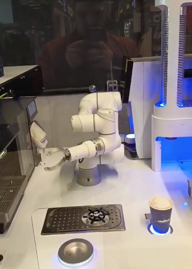 robotic arm picking up a cup of coffee. The arm is white and gray and has a claw-like gripper at the end. The coffee cup is on a lit platform with the Lavazza logo. The robotic arm picks up the cup and rotates to a horizontal position. The scene is inside a glass enclosure. A person can be seen in the reflection in the glass, holding a phone, presumably filming the robot. Other machines and equipment are in the frame, suggesting a demonstration or exhibit setting.