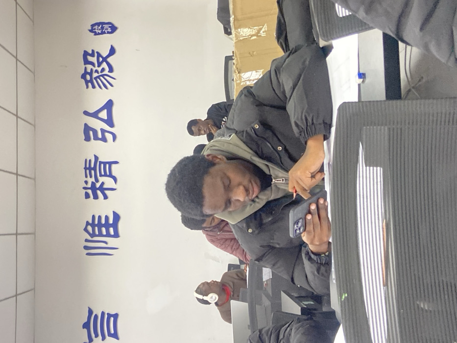 In a brightly lit room, a young, dark-skinned man is engrossed with his smartphone. He wears a black puffer jacket with a gray hoodie underneath. Other people are seated at desks, some wearing headphones, suggesting a work or study environment. Chinese characters are displayed on the wall behind them. The room appears modern, with computer monitors visible on the desks.