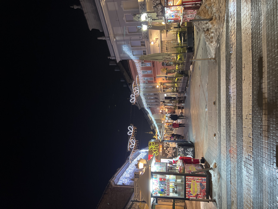 A night view of a European street lined with lit-up buildings and Christmas decorations. People walk down the street, and on the right, a pedestrian crossing is visible. A small vendor stand with candy and treats sits at the edge of the street, adding to the festive atmosphere. The sky is dark, contrasting with the bright lights of the street.
