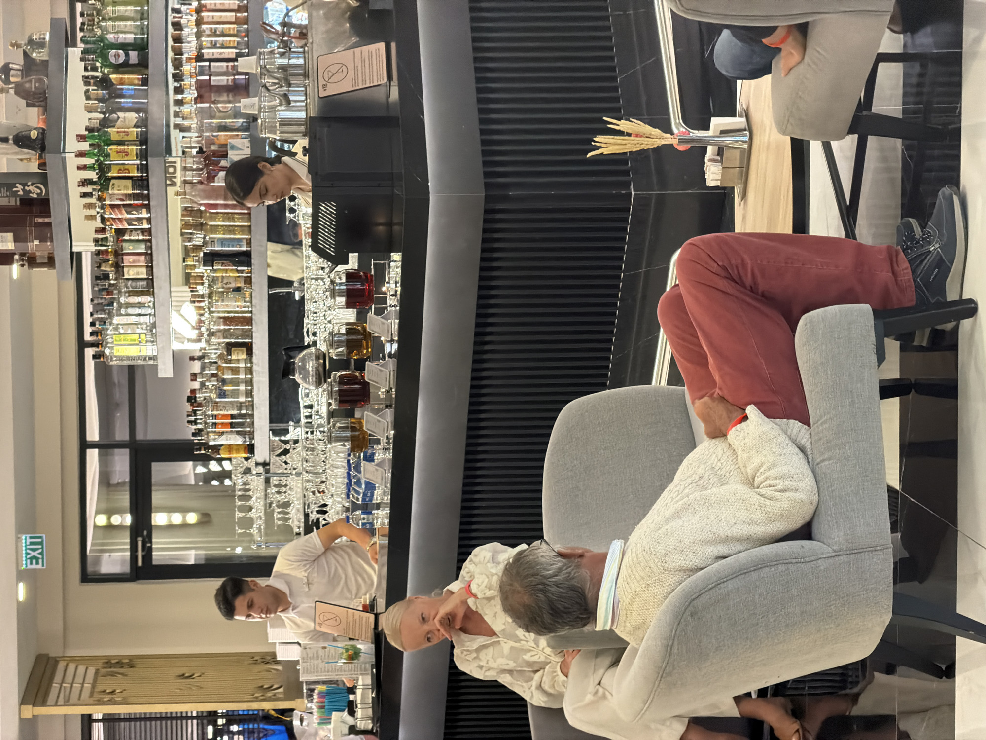 n interior view of a bar, likely located in Serik, Turkey. There is a well-stocked bar with numerous bottles of alcohol displayed prominently. Two bartenders are visible; one is working behind the bar, attending to the bar's supplies, and the other is seen preparing drinks. Several customers are present. One man is reclining in a grey armchair and resting his head on the shoulder of a woman who is seated next to him. Another person is seated in a chair with red pants and sneakers. The furniture appears modern, and the overall atmosphere suggests a contemporary bar setting. There is an 'EXIT' sign above the bartender in the background, hinting at the location.