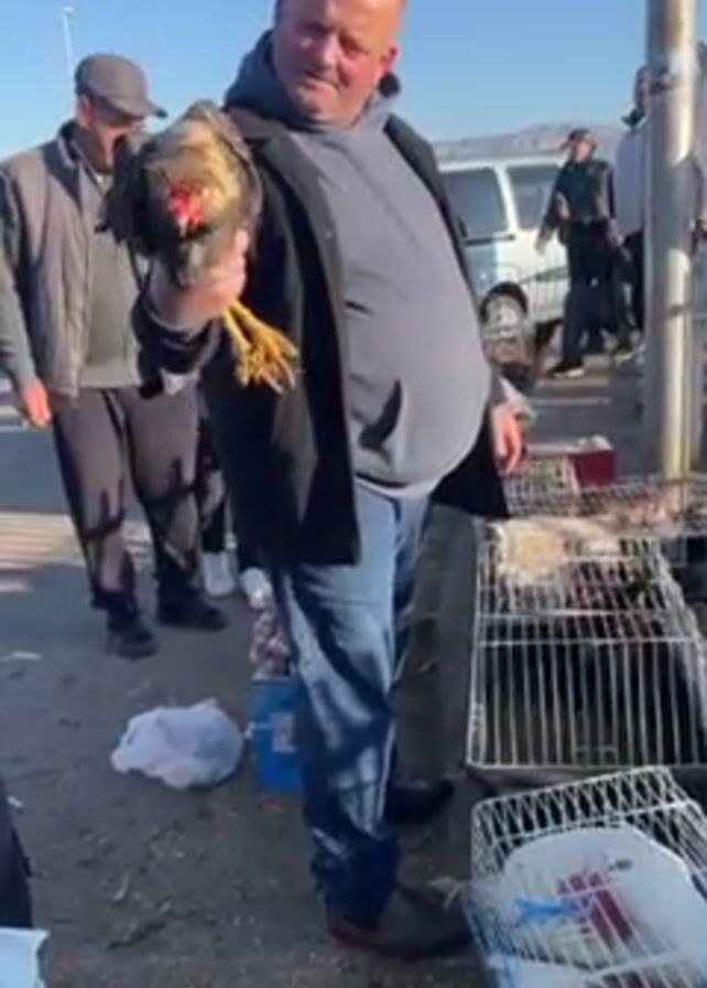 man holding a chicken at what appears to be an outdoor market. He is standing in front of several wire cages containing chickens and ducks. Other people are visible in the background. The market area looks to be outdoors on a sunny day. The man holding the chicken is wearing a dark jacket and jeans. The chicken is mottled black and brown with yellow legs. Other cages contain different breeds and colors of chickens and a white duck.