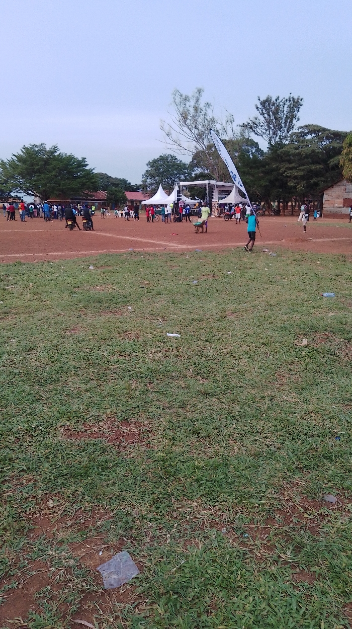 An outdoor scene depicts a large, open field comprising reddish-brown dirt and sparse green grass, littered with plastic bags and debris, under an overcast sky. In the midground, approximately 30-50 individuals are gathered. A cluster of people stands in the background near two white marquee tents and a central metal scaffolding structure, possibly a stage. Another individual in a light green shirt pushes a metal wheelbarrow towards the right. A person in a blue shirt walks rightward, carrying a tall white flag with blue lettering. A motorbike is visible near a group of people in the left midground. Buildings with light-colored walls and reddish roofs are partially visible through dense trees lining the background. The location is an unidentified public or event ground within an unspecified city.