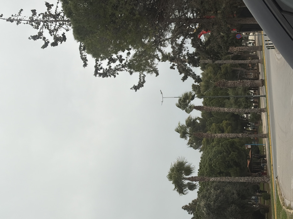 The image depicts an overcast day in Vouliagmeni Municipal Unit, Greece, featuring a park area adjacent to a curved asphalt road