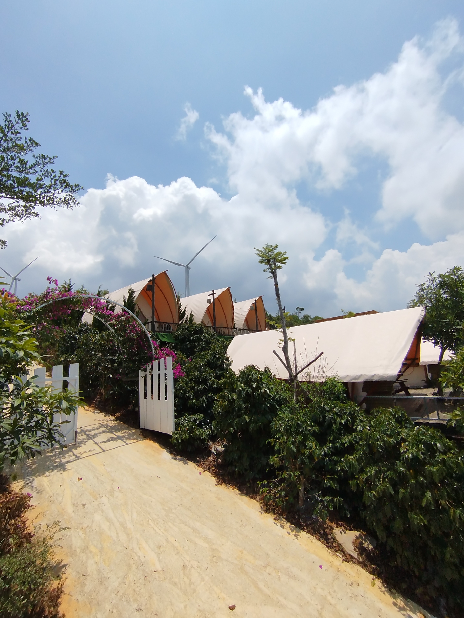 view of a resort in Phát Chi, Vietnam, taken on a sunny day. The scene is dominated by a cluster of tent-like structures with white or orange canvas roofs nestled amid lush greenery. A dirt path leads up to the structures through an open white picket fence gate. Bougainvillea bushes with vibrant purple flowers line the path and decorate the arbors framing the entrance. In the background, wind turbines are visible, suggesting the resort prioritizes sustainable energy. The sky is blue with scattered white clouds.