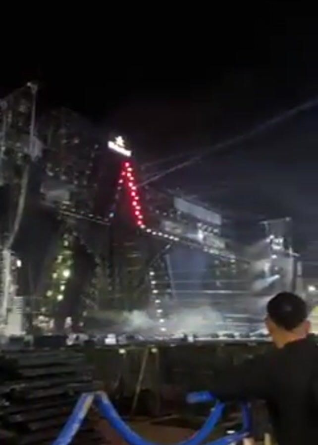 night scene of a large outdoor event. It appears to be a music festival or a similar large gathering. The initial shot focuses on a large stage with complex lighting, smoke effects, and a prominent star-shaped structure. The perspective then shifts to reveal a crowd of people, some standing behind a railing, watching the stage. Subsequently, the camera pans out to show the street scene with pedestrians, motorcycles, and cars, illuminated by streetlights and the event's light show. Buildings are visible in the background, indicating an urban setting. The overall atmosphere suggests a vibrant and bustling night event in a city.