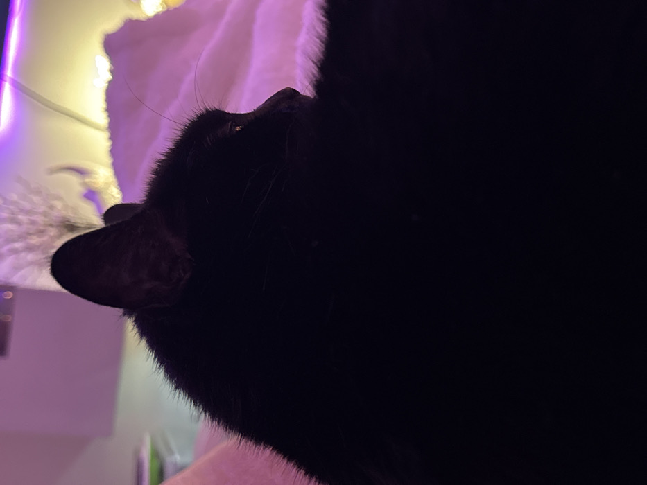 A close-up shot captures a black cat in a dimly lit environment. The cat's head is angled upwards, revealing a single eye, a pointed ear, and a hint of its nose. Fluffy white or light pink fur is seen in the background, possibly a blanket or cushion, along with blurry lights. The black fur of the cat dominates the right side of the frame, creating a stark contrast with the lighter background elements. The overall impression is intimate and shadowy.