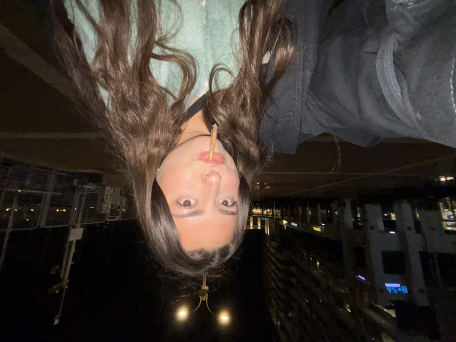 A young woman with long, dark brown hair poses upside down with a lit cigarette in her mouth