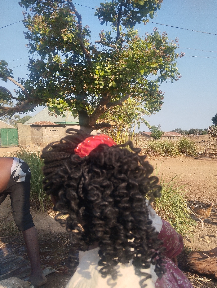 A girl with dark curly hair stands in a rural setting. A red headband adorns her head. To her left, a man in dark shorts is partially visible. Behind the girl, a large tree with green leaves dominates the scene. Buildings with light-colored brick walls and a roof are visible in the background. Tall grasses and a chicken add to the natural environment. The ground appears to be dry, sandy, and open. The sky is clear and blue.