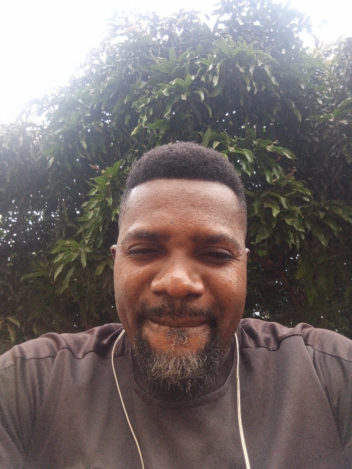 A selfie depicts a middle-aged Black man with a salt-and-pepper beard. His hair is short and dark. He wears a dark t-shirt and has white earphones hanging from his neck. He appears to be outdoors, with a large, leafy tree providing a backdrop. The man's expression is subtle; he is looking directly at the camera. The lighting is diffused, giving the image a soft, natural feel.