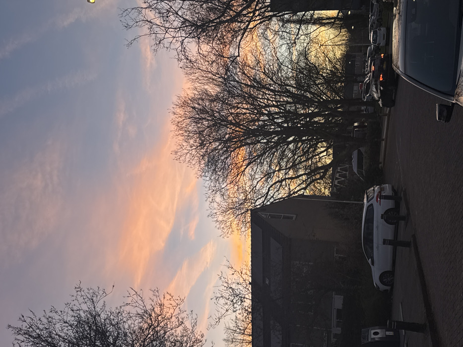 The image displays a residential street scene in Sliedrecht, Netherlands, under a sky exhibiting sunset or sunrise colors. The upper sky is light blue with faint, streaky clouds, transitioning to vivid orange, pink, and yellow hues near the horizon. The immediate foreground shows a dark paved surface with two dark bollards and a dark utility bin on the left. The hood of a dark vehicle is partially visible on the bottom right. A white station wagon is parked facing away on the left side of the street. Adjacent to it stands a two-story residential building with a dark, pitched roof fitted with multiple solar panels and a visible dormer window. Numerous bare deciduous trees, primarily a large one dominating the center-right, are silhouetted against the bright sky. Further along the street, a dark SUV with illuminated taillights is visible on the right, alongside other parked vehicles. A white van is discernible behind the trees on the right, and an illuminated amber street light marks the far right horizon. No individuals are present in the frame.