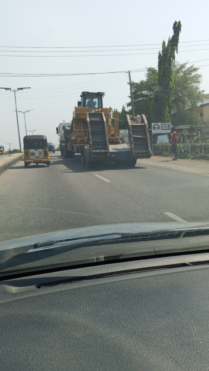 The image displays a daytime street scene observed from within a vehicle, with the dashboard and windshield wipers visible in the foreground. A multi-lane asphalt road with white markings extends into the midground. In the left lane, a yellow motorized tricycle precedes a white heavy-duty truck. The truck is towing a dark blue flatbed trailer, upon which a large yellow bulldozer or track-type tractor is loaded, facing forward. On the right side of the road, a dirt shoulder is present, where a person wearing a red shirt and dark pants stands stationary next to a partially visible sign bearing a cross emblem and text indicating a church. Tall, slender trees with dark green foliage, other green trees, utility poles, and power lines are also visible on the right. The left side of the road features a concrete barrier and streetlights. The sky is bright and appears hazy. The scene is located in the city of Unknown, Unknown.