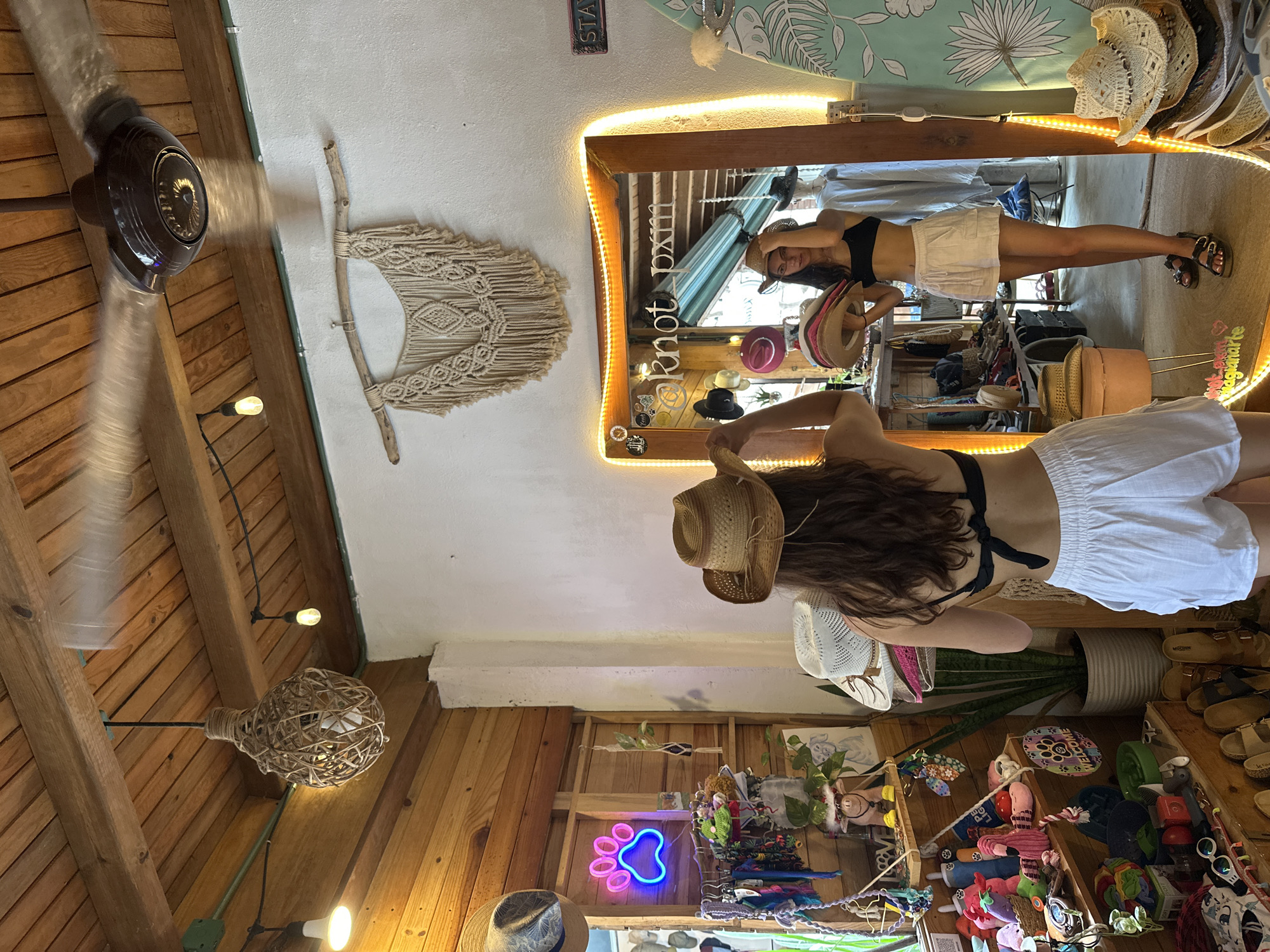 A brightly lit shop interior in Brisas de Zicatela, Mexico, shows two women reflected in a mirror, one trying on a straw hat and the other trying on several hats