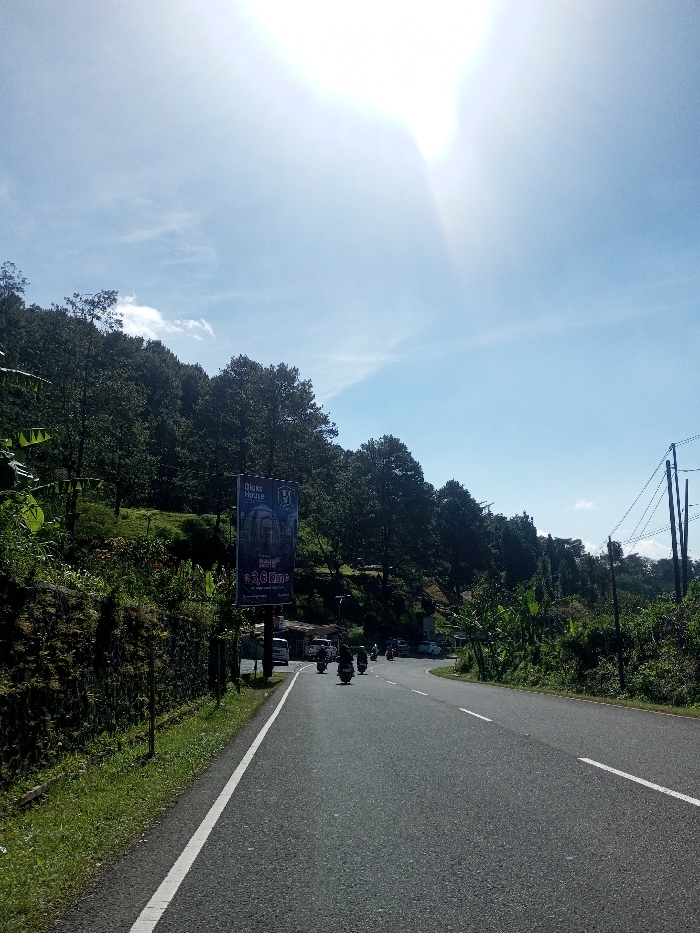 The image captures a sunlit, two-lane asphalt road curving gently right, located in Ka Thaung (Upper), Myanmar. The sky is a clear blue, dominated by a bright sun flare in the upper right quadrant, indicating strong daylight. The road is marked by a solid white line along its left edge and a broken white centerline. To the left, a grassy shoulder transitions to a stone retaining wall, beyond which a steep, densely forested hillside rises. A large, vertical billboard is positioned on this slope, displaying "Glass House" in English text, an architectural image, and additional text in Burmese script. On the right side of the road, abundant green foliage and trees line the terrain, with utility poles and power lines visible further in the distance. Approximately five motorcycles, each with a rider, are observed traveling along the road away from the viewer. Two light-colored cars are partially visible further down the road on the right. The scene depicts a forested, hilly landscape under clear weather conditions with typical road traffic.