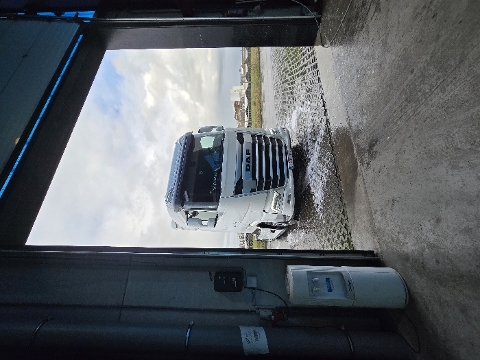 n exterior view from within a large, open industrial-style building located in Ostend, Belgium. A white DAF brand semi-truck tractor unit is positioned directly outside the open doorway, facing the camera. White foam and water cover the grid-patterned paver ground in front of and around the truck, indicating it is undergoing a washing process or has just been washed. The truck's headlights are illuminated, and its Belgian license plate, "1-YBB-702", is legible on the front bumper. The sky above is overcast with scattered clouds, and distant urban buildings alongside undeveloped land are visible in the background. Inside the building, to the left of the doorway, a light-colored Cligo water cooler/dispenser stands beside a grey pillar. A black electrical control box is mounted on the wall above the water cooler. The concrete floor inside the building is wet, with a blue light strip visible along the upper frame of the open doorway. No individuals are present in the scene.
