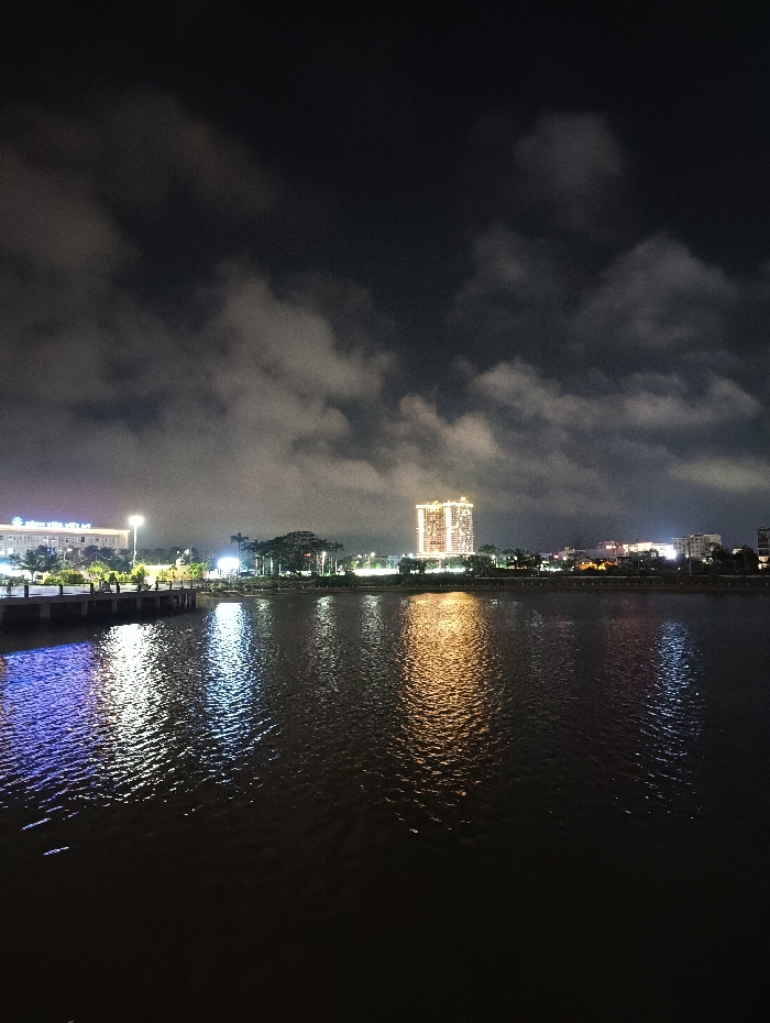 This nighttime long shot depicts an urban waterfront in Tuy Hòa, Vietnam