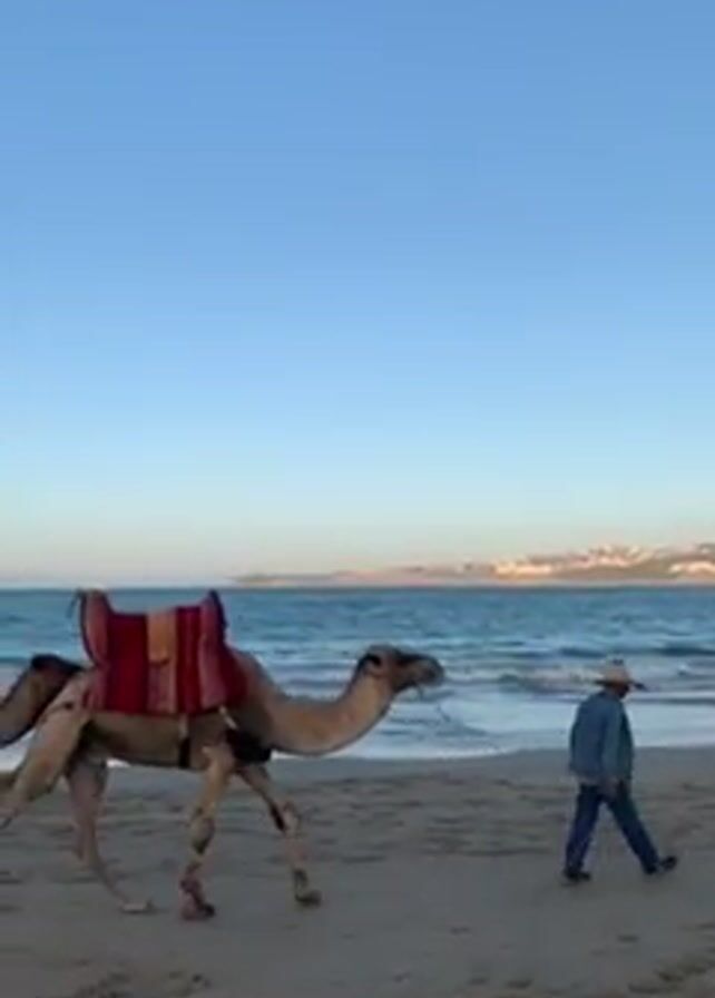 two dromedary camels walking on a beach next to the ocean. The camels are equipped with red and beige decorative saddles. A man wearing a blue denim jacket and a light-colored hat is leading the camels with a rope. The sand is light brown, and the ocean is blue with small waves. The sky is clear blue. There are cliffs or a low mountain range visible in the background across the water. The video appears to be taken during the daytime.