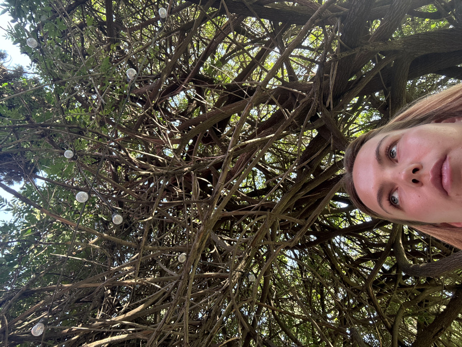 A woman's face is visible on the right, angled upwards toward a dense canopy of tree branches. The intricate network of branches and vines, interspersed with small green leaves, fills the majority of the frame. Strings of lights with round bulbs are hung amongst the branches, adding a decorative element to the natural setting. The overall perspective creates a sense of looking up into the tree's interior.