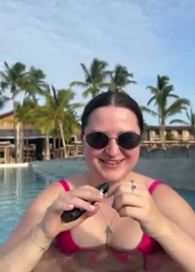 A woman with round sunglasses and a pink bathing suit stands chest-deep in a pool, smiling. She is holding a small black device, which she appears to be refilling with a clear substance. Palm trees and buildings are visible in the background under a blue sky with scattered clouds.