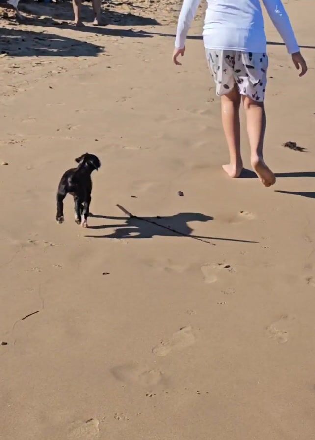 child walking on a sandy beach, followed by a small black dog. The child, wearing a white long-sleeved shirt and patterned shorts, walks barefoot towards the edge of the water. The dog is small and appears to be running after the child. The beach is sunny and crowded with people sitting in beach chairs under umbrellas. Palm trees and other greenery are visible in the background, adding to the beach atmosphere. The camera follows the child and dog as they move along the shoreline.
