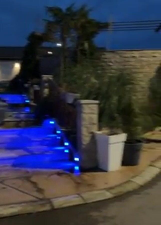 At dusk, the camera pans across a street with a house with blue-lit stairs leading up to it