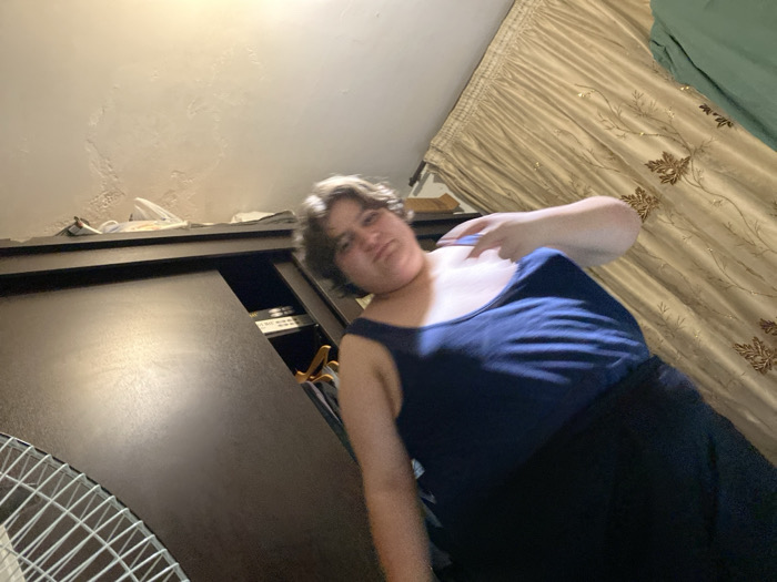 This image depicts an indoor scene, located in Barza Municipality, Syria. A single individual, appearing to be a young adult with short, dark hair, is positioned in the foreground, angled towards the left side of the frame. The person is wearing a dark blue tank top and dark lower garments, possibly shorts or pants. Their right arm is raised, with the hand touching the upper chest area of the tank top. The individual's head is tilted, and they are looking towards the camera with a neutral expression. The background features a dark brown wardrobe or closet, part of which extends into the upper left quadrant of the image. On top of this furniture, various indeterminate objects, including what appears to be a plastic bag and some papers, are visible. Above the wardrobe, the ceiling shows signs of uneven texture or possible water damage in several areas. To the right, a set of light-colored, possibly gold-toned, curtains with a repeating leafy pattern hangs vertically. A glimpse of a plain green fabric is visible in the upper right corner, partially obscured by the curtains. In the lower left foreground, the protective grill of a white electric fan is partially visible. The lighting is artificial and appears to originate from above, creating shadows.