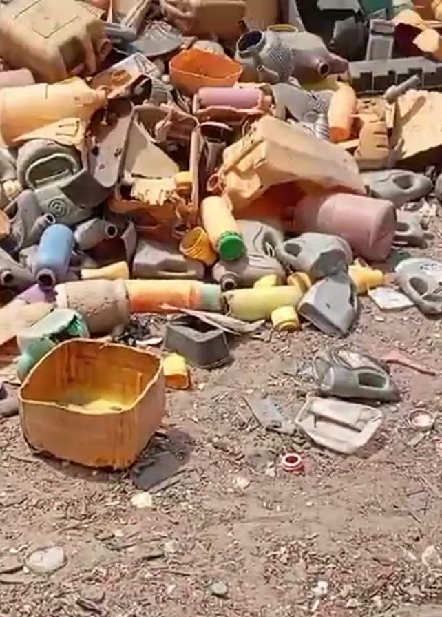 large area covered in piles of plastic waste. The waste includes plastic containers, bottles, and other various items. The area appears to be an outdoor location with a dirt or gravel ground. In the background, there are buildings and some vegetation visible. The scene suggests an uncontrolled disposal site or a recycling center.