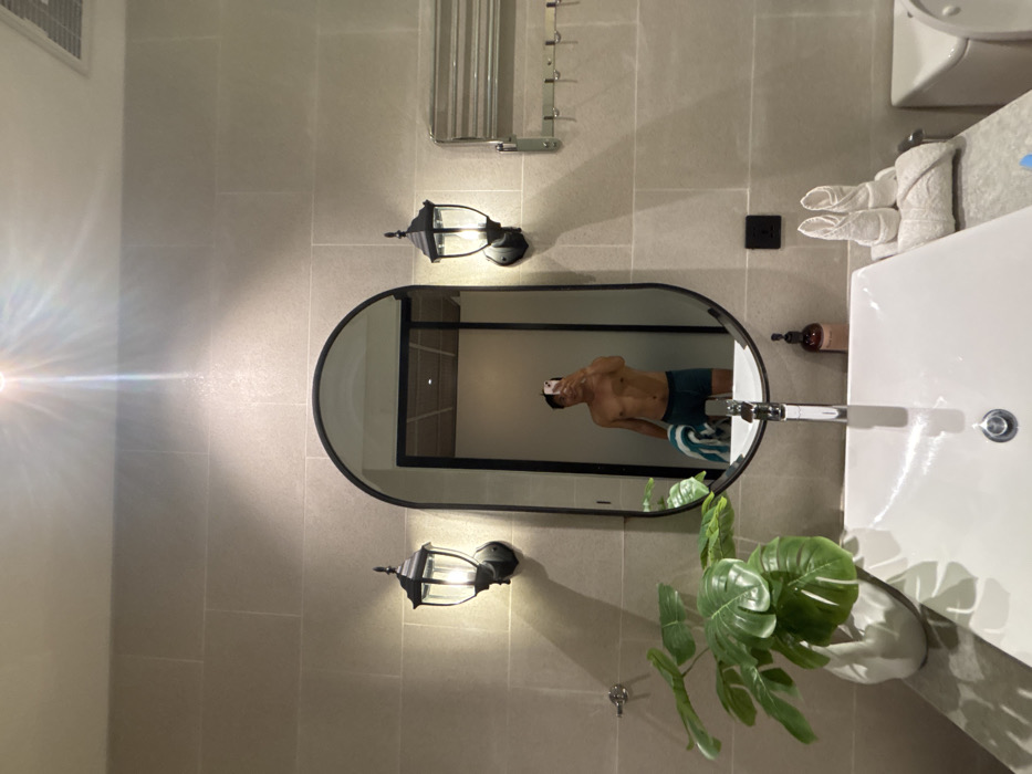 A forensic description of a bathroom scene in Kerobokan, Indonesia. The image captures a male individual taking a selfie, reflected in a large, vertically oriented oval mirror with a black frame. The male is shirtless, wearing dark boxer briefs, and holding a multi-striped towel in his left hand while operating a light-colored smartphone with his right hand. The mirror's reflection includes a dark-framed doorway and a light-colored ceiling. The bathroom features light-colored, rectangular tiled walls. A white ceramic vessel sink with a chrome gooseneck faucet is centered beneath the mirror. To the left of the sink, a green artificial plant in a white ceramic vase is placed on the counter. To the right, a dark brown pump bottle and two white, decoratively folded towels rest on the counter. Two black lantern-style sconces, emitting warm light, are mounted on the wall, flanking the mirror. A bright ceiling light fixture above casts a sunburst glare. On the right wall, a chrome multi-bar towel rack with four hooks is affixed. A white toilet is partially visible on the far right. The environment appears clean and illuminated.