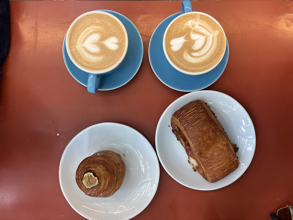 - "Two cups of latte with latte art sit atop blue saucers, paired with pastries on white plates" by FM-3sGQI2, licensed under CC BY 4.0