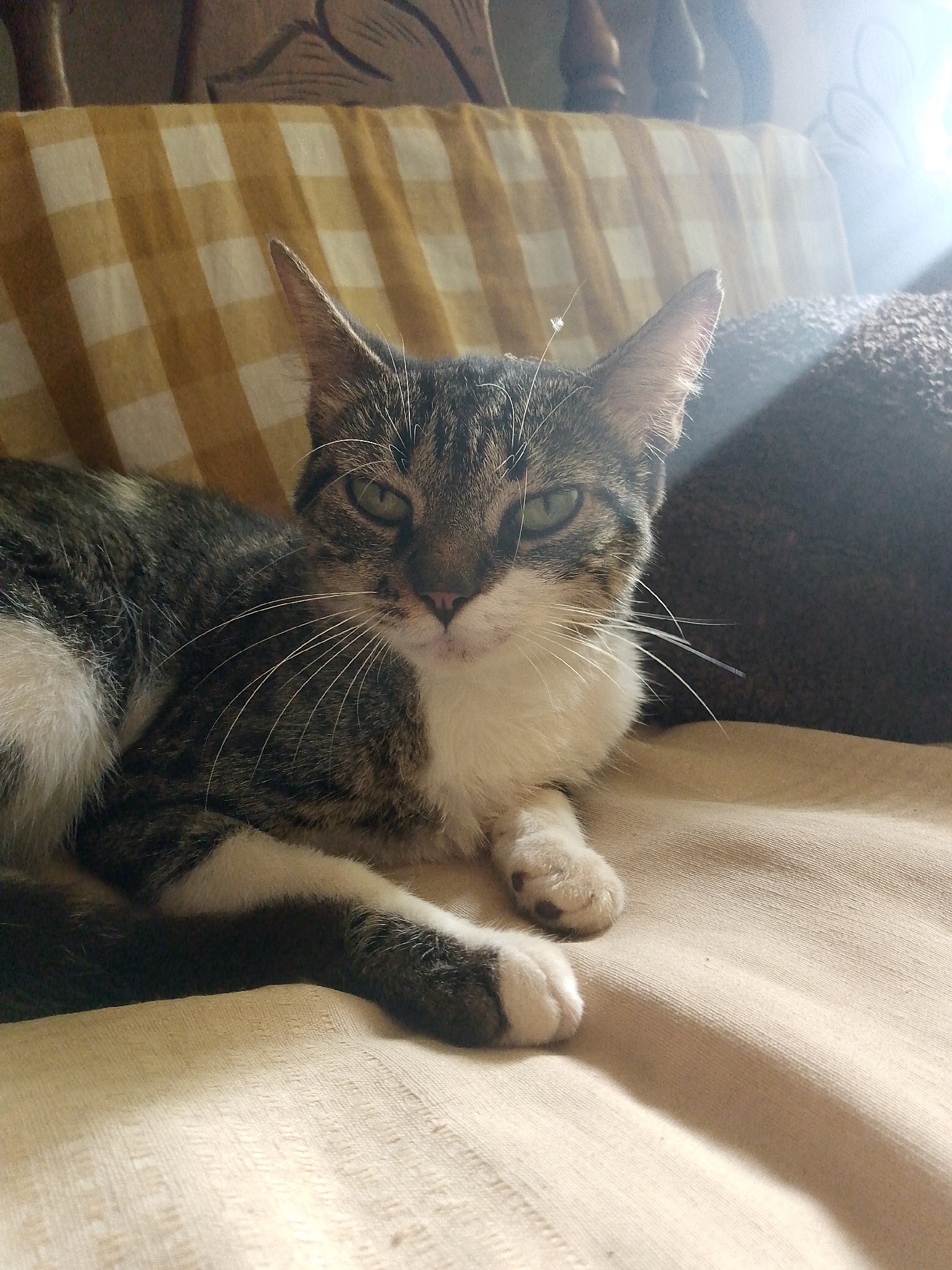 A domestic short-haired cat with tabby and white markings is lying on a beige couch. The cat has green eyes and is looking directly at the camera. Behind the cat is a yellow and white checkered patterned couch cushion. A dark brown pillow is situated to the right of the cat, partially obscured by a bright light. The background includes a wooden headboard with decorative carvings and a white wall. The image was likely taken indoors during the day, given the bright lighting. The location is not identifiable in the city of Juan Griego, Venezuela.