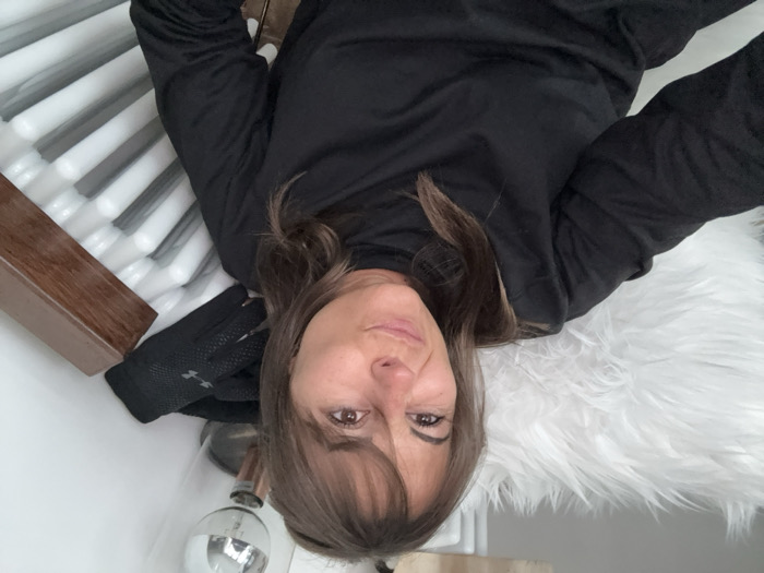 A woman wearing a black long-sleeve shirt reclines with her head near the bottom of the frame