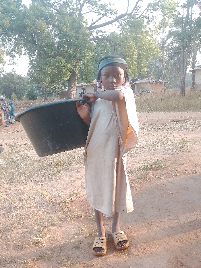 A young person, likely a child, carries a large black tub on their shoulder. They wear a tan-colored, loose-fitting garment and sandals. The background shows a rural setting with dirt ground, sparse vegetation, and simple structures resembling huts or houses. Trees are visible in the background. The lighting suggests it may be morning or late afternoon. The child appears to be looking directly at the camera.