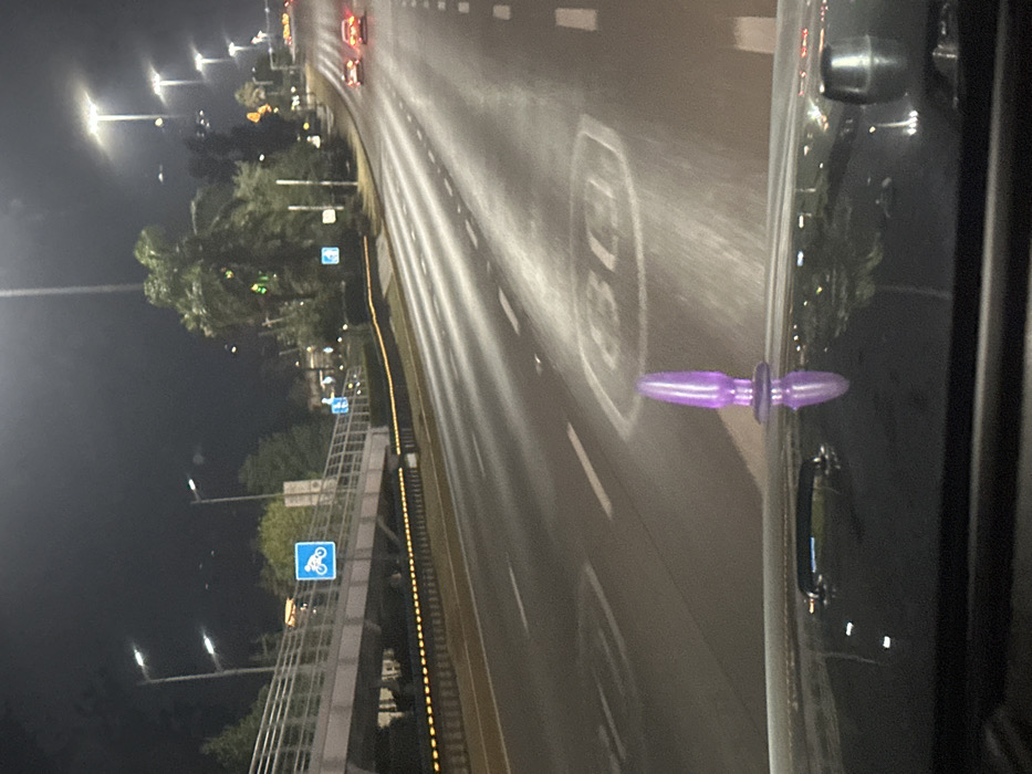 At night, a car travels on a road with a painted "80" speed limit. Streetlights illuminate the scene. A pedestrian bridge with bicycle lane signs runs parallel to the road. A purple, double-sided earplug-like object is stuck to the car's window or door, creating a surreal juxtaposition against the nocturnal urban backdrop.