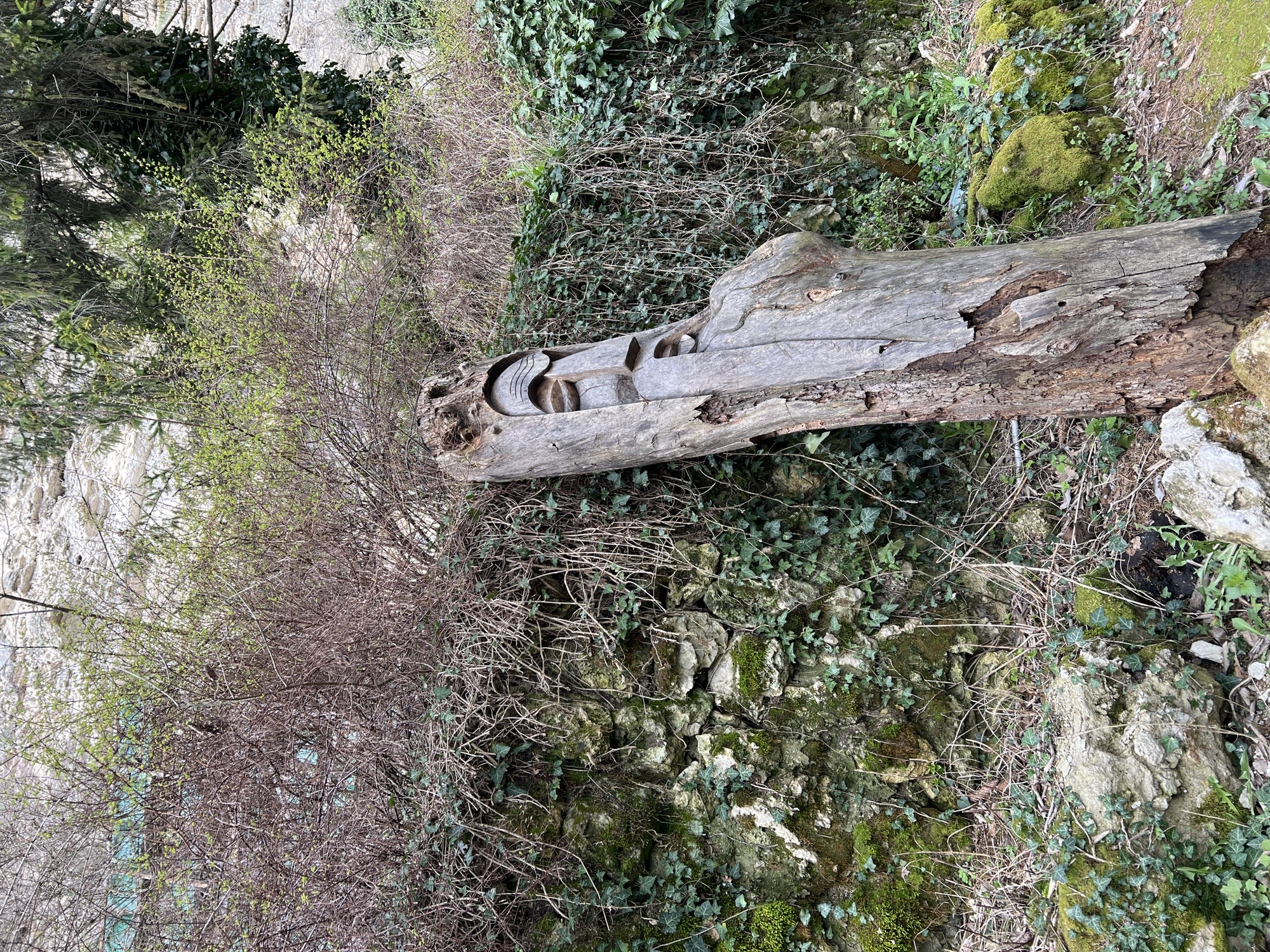 The image depicts a carved wooden log lying on a hillside in what appears to be a natural or landscaped area