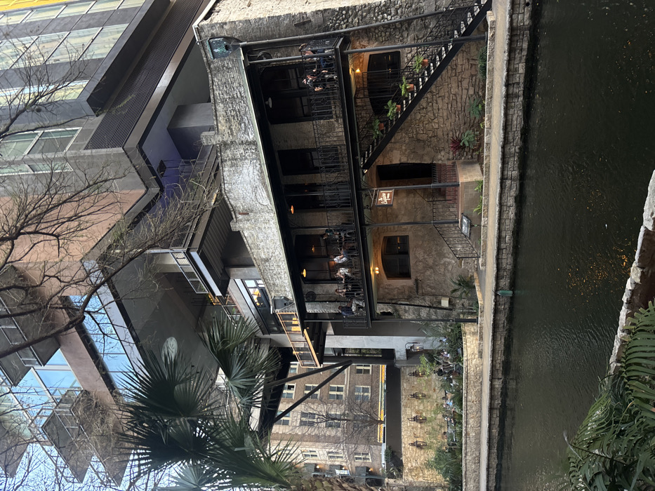 The scene is an urban waterfront view along the San Antonio River Walk, San Antonio, United States