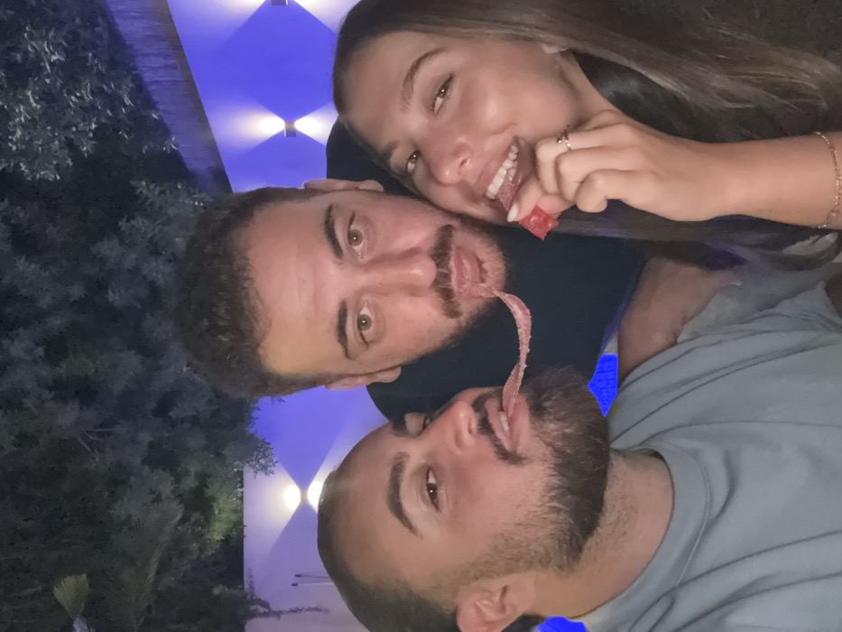 The image depicts three individuals in an outdoor setting at night in Rishon LeZion, Israel. Two men and one woman are positioned closely, appearing to be in a selfie or close-up group photograph. The man on the left, with a beard and dark hair, wears a light-colored t-shirt. The man in the center, with short dark hair and facial hair, wears a dark shirt. Both men are extending their tongues, sharing a single long, pink candy strip between them. The woman on the right, with long dark hair, smiles while holding a distinct red rectangular candy in her right hand, near her mouth. She wears a ring on her right ring finger and a bracelet on her right wrist. The background features a white wall illuminated with blue ambient light and two wall-mounted light fixtures emitting upward and downward beams. Dark foliage is visible above the wall.