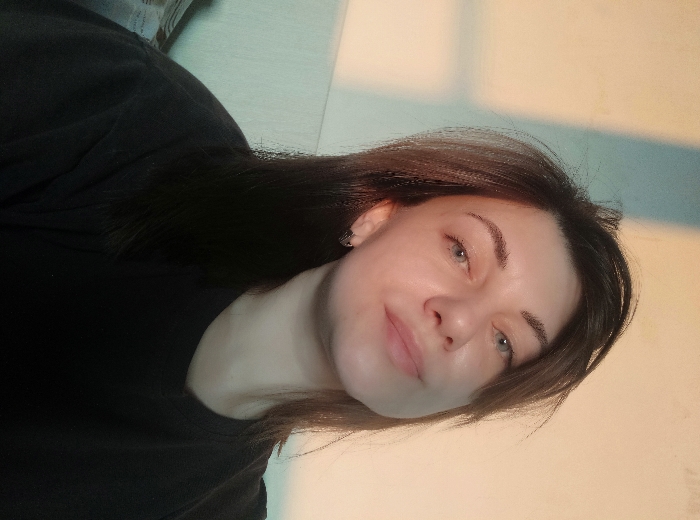 An adult female is depicted in a medium shot, her head tilted slightly, looking directly at the viewer with a neutral to slightly smiling expression. She has medium-length dark brown hair, blue eyes, and fair skin, with a small silver-colored hoop earring visible in her left ear. She is wearing a dark, possibly black, crew-neck garment. The background consists of a plain wall, illuminated by warm, directional light entering from the upper right, casting shadows on the surface. The wall transitions from a light beige/cream color on the right to a lighter, faded blue-green tone on the left. The scene is situated in the city of Kuyeda, Russia.