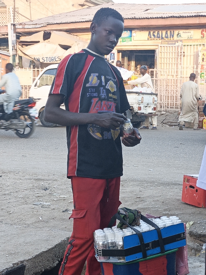 A young male, dark-complexioned with short, dark hair, stands outdoors in Gwagwarwa, Nigeria. He wears a black short-sleeved t-shirt with red side panels, featuring yellow and purple "LAKERS" branding and "STAY STRONG" text. His attire includes red cargo-style sweatpants with black side stripes. He holds a small, clear glass bottle with a silver-colored cap in his right hand, seemingly manipulating the cap. Adjacent to him on the ground is a blue and red cooler containing numerous identical small, clear bottles with silver caps, secured by black straps. The ground is a mix of dirt and gravel, with an uneven concrete edge in the lower-left foreground. In the midground, a white pickup truck is parked, behind which a male in light-colored traditional attire is visible. To the left of the truck, a person on a motorcycle, wearing light clothing, is in motion, blurred. Further back, a storefront with a corrugated metal roof displays "ASALAN STORES" and a partially visible "AN STORES" sign. Another male in light traditional wear is visible near the "ASALAN STORES" entrance. The scene is illuminated by natural light, casting soft shadows.