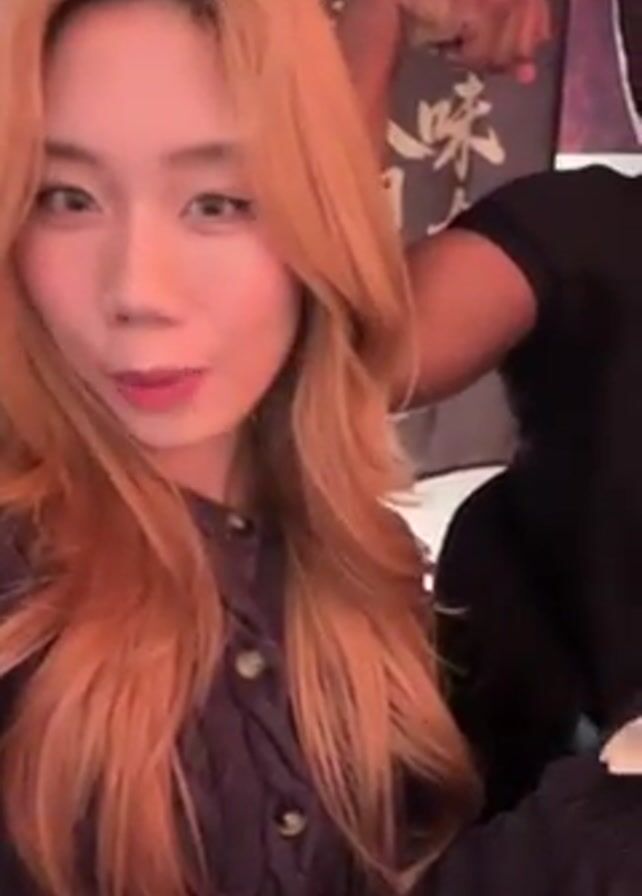 A young woman with long, wavy strawberry blonde hair and fair skin is shown from the shoulders up. She wears a dark knit cardigan and is posing for the camera. In the background, the flexed bicep of a darker-skinned person is visible, along with a dark banner with Japanese text. The woman winks, makes a kissing face, and holds up a folded white napkin. The lighting is warm and slightly reddish.