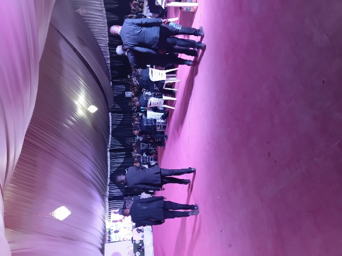 An indoor event shows rows of attendees seated in chairs. Two men in suits walk towards the audience, while others stand near the seating area. The setting includes a large tent-like structure with draped fabric, possibly for a wedding or formal gathering. A pink carpet covers the floor.